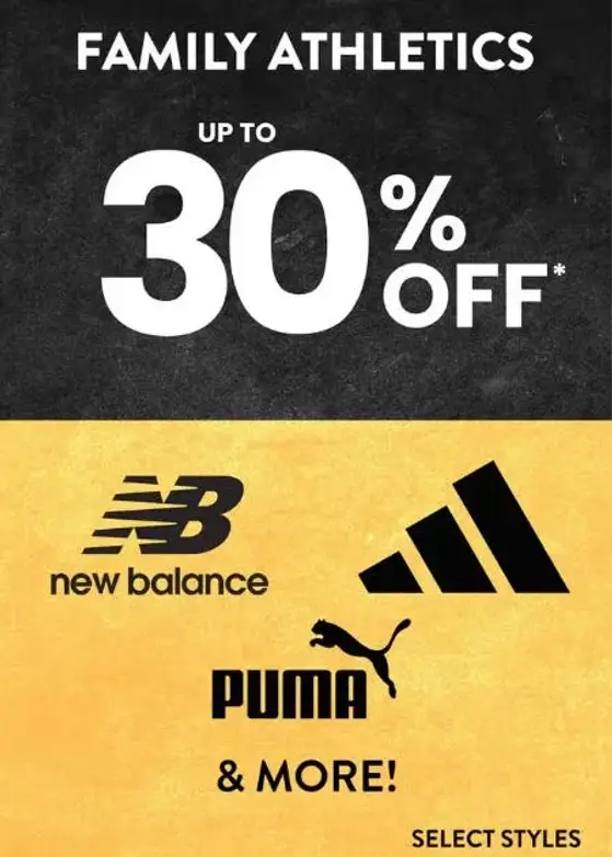 Hurry in and take up to 30% off on family athletics in store for a limited time.