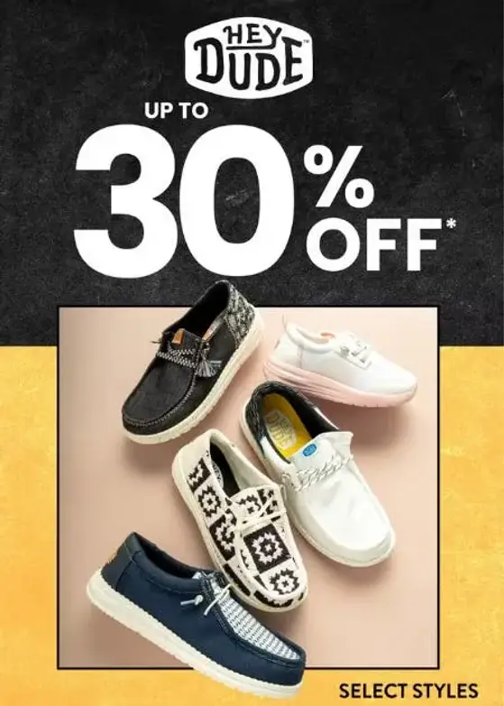 Stop by and get up to 30% off on Hey Dude shoes in store for a limited time.