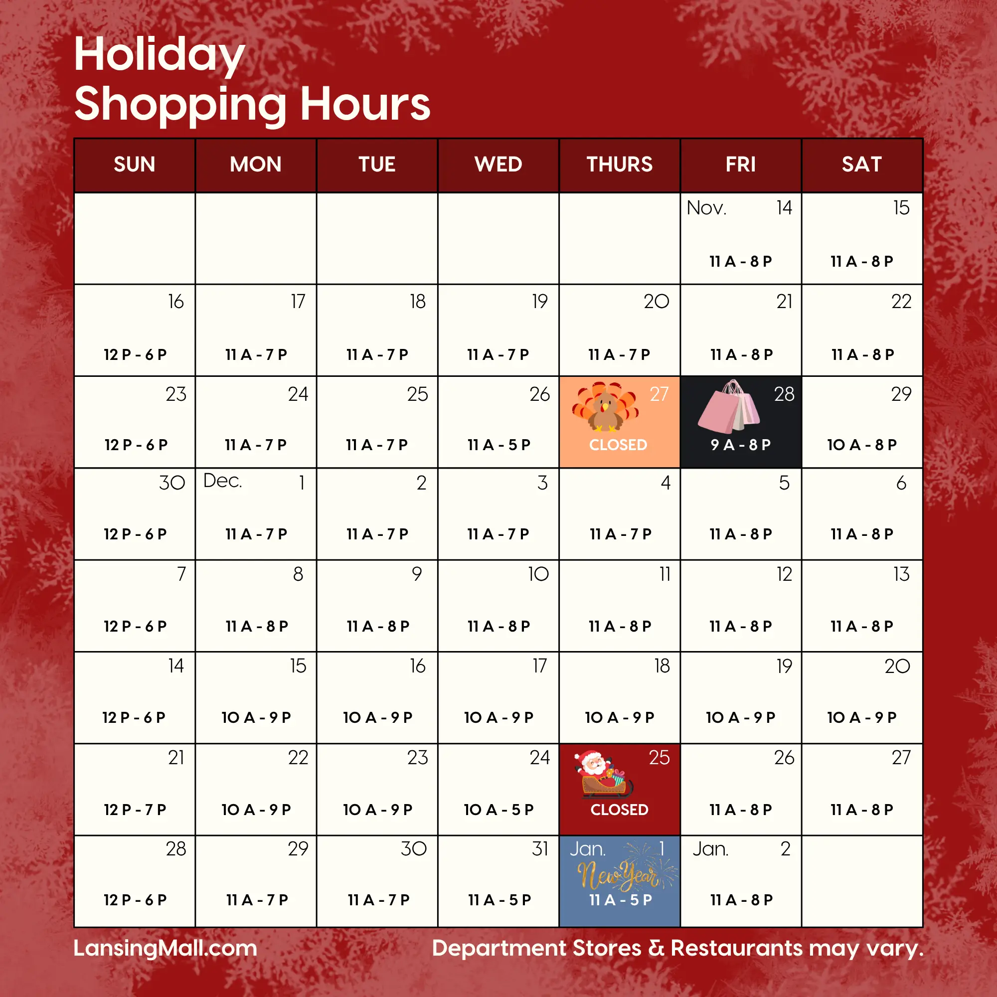 11:00 AM - 05:00 PM - New Years Eve - Stores may close early